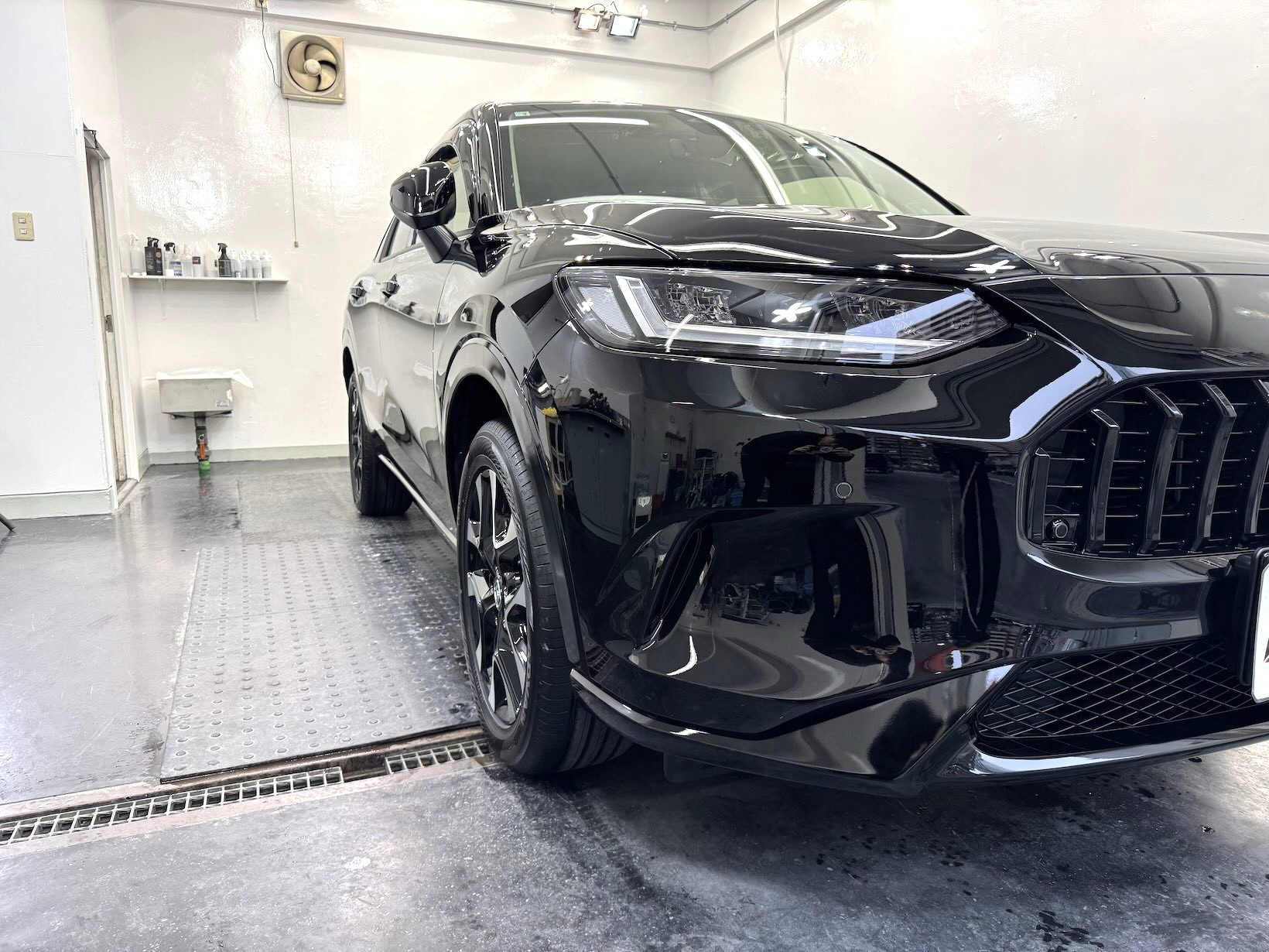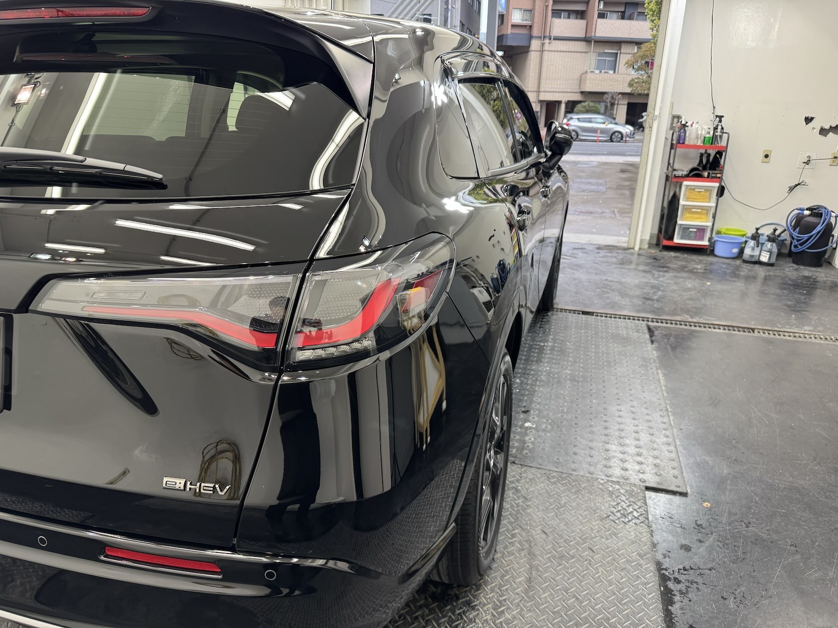 今回施工したコーティングは、高硬度かつ高い防汚性能を持つガラスコーティング。ZR-Vのようにフロントのプレスラインとリアの曲線美がしっかり出ている車両とは非常に相性が良く、施工後はボディラインがよりしっかり、滑らかに際立ちます。また、ボディの色が黒ということで全体的な艶が数段階アップして、質感がワンランク上の仕上がりに。